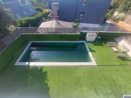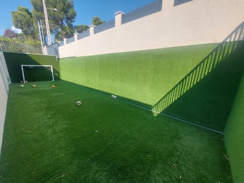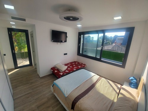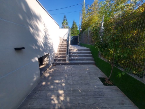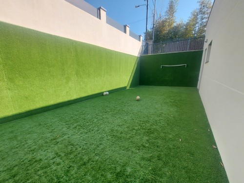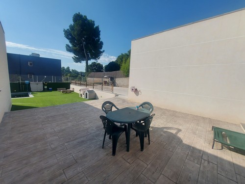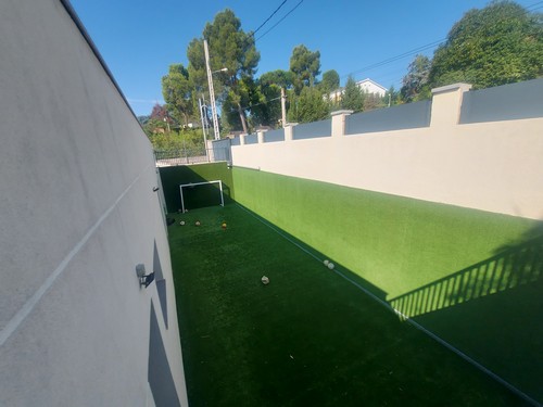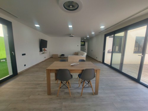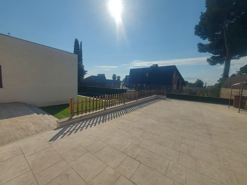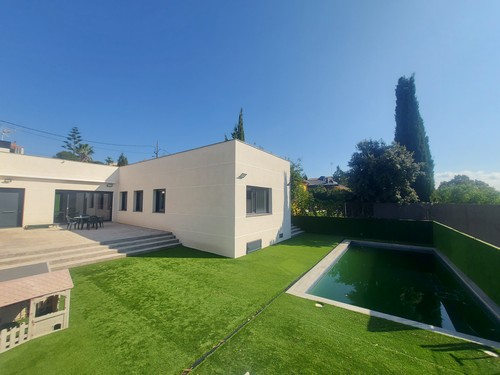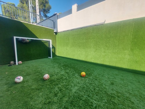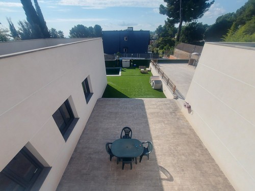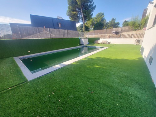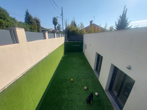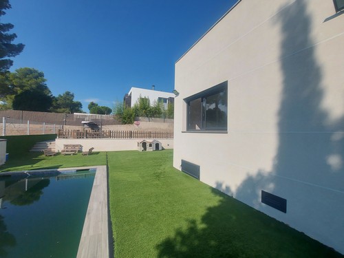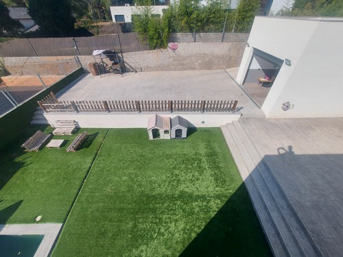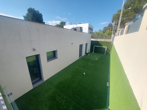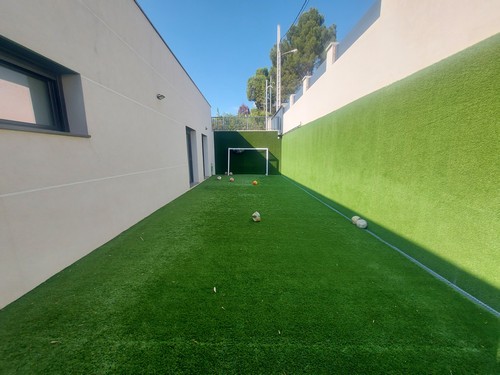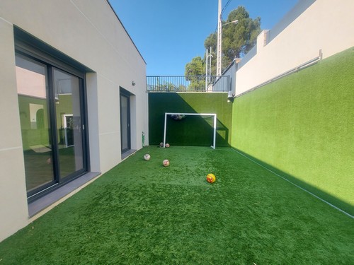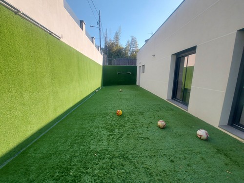 En el exterior de la vivienda un precioso jardín prácticamente llano con césped artificial. Encontramos una gran piscina, zona chillout y zonas destinadas a diversión.