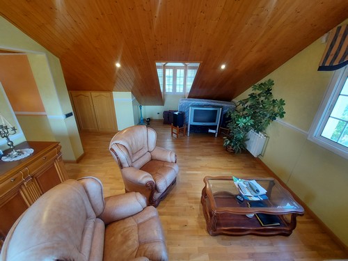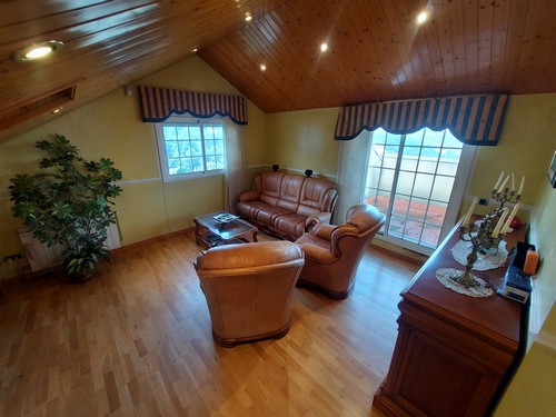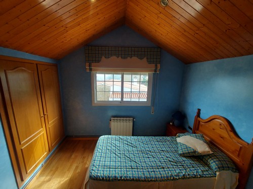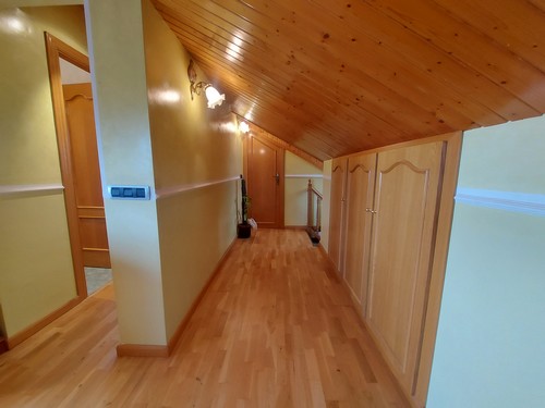 Planta Superior: En esta altura encontramos una bonita sala polivalente con techos altos revestidos de madera que aportan una gran sensación de calidez, además de una habitación doble ideal para invitados o para destinar como despacho. Desde aquí accedemos al solárium, perfecto para disfrutar de las vistas despejadas y del sol durante todo el día.