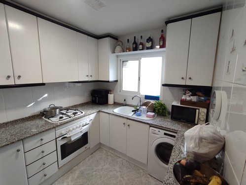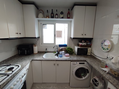 Desde el salón también accedemos a la cocina, totalmente equipada, de tamaño funcional y con muchas posibilidades para actualizarla y diseñarla según las necesidades actuales.