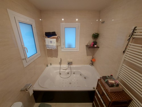 A través de un pasillo, encontramos la zona de noche compuesta por 2 habitaciones individuales, 1 habitación en Suite con vestidor y baño completo privado con gran jacuzzi y un baño adicional completo con plato de ducha para dar servicio al resto de estancias de la vivienda. Desde la habitación en Suite tenemos acceso directo a la zona del jardín.