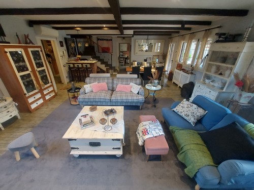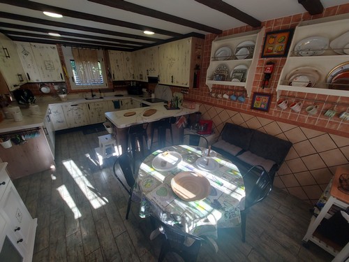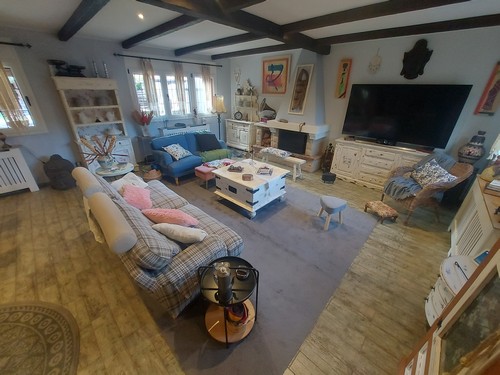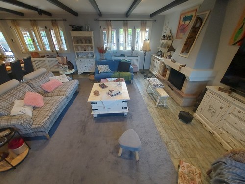 Planta Principal: Encontramos un gran salón/comedor con chimenea de 60 m2 aproximadamente con conexión directa a la zona del jardín y la piscina. En esta misma altura encontramos la cocina office completamente equipada con zona de comedor. Adicionalmente ofrece un baño completo con ducha de hidromasaje y práctica zona de almacenamiento bajo de las escaleras que nos llevan a la Primera Planta.