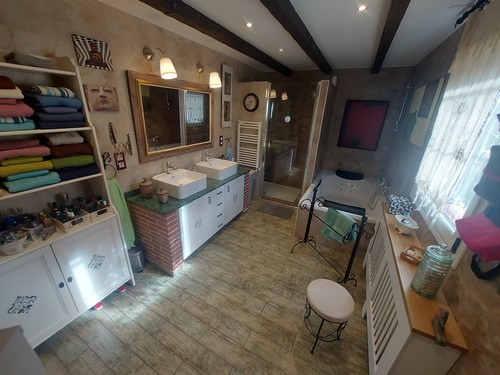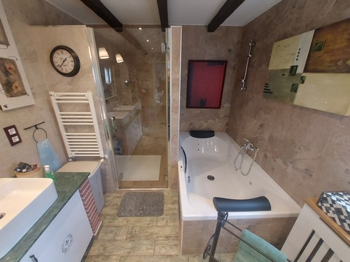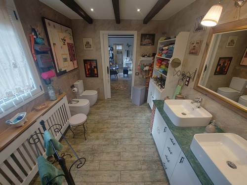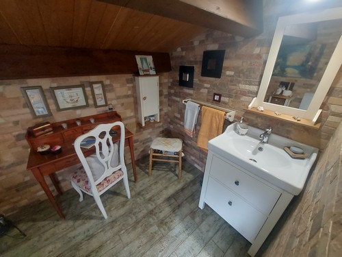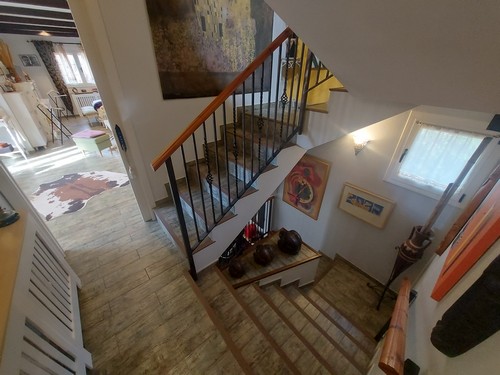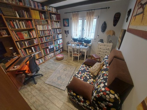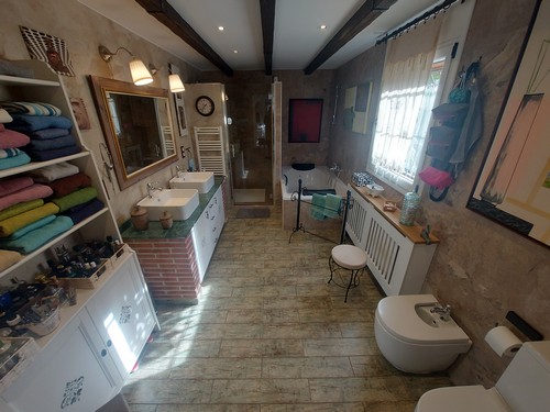 Planta Primera: Encontramos una habitación doble que actualmente se le da uso como oficina y biblioteca, también encontramos la habitación principal en Suite de gran tamaño con baño privado con bañera de hidromasaje y plato de ducha. La Suite también dispone de gran vestidor. Esta habitación de aproximadamente 50 m2 podría llegar a separar para convertirla en 2 habitaciones dobles.
