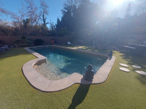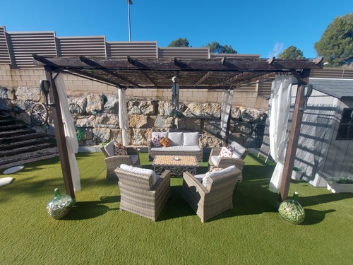 Cabe destacar el precioso exterior de esta vivienda donde encontramos una gran piscina de agua salada, espectacular zona de porche y con zona de barbacoa.