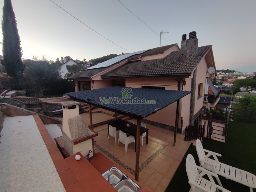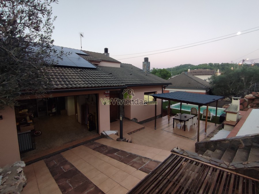 Desde el exterior accedemos tanto al garaje privado con entrada directa a la vivienda, puerta automatica y zona de almacenaje, como al acogedor salón-comedor exterior con chimenea, zona polivalente con acceso a un baño completo con bañera, luz natural durante todo el día y con salida a una soleada terraza, perfecta para disfrutar de las vistas al jardín acompañada de acceso directo a la piscina y con vistas al pueblo.